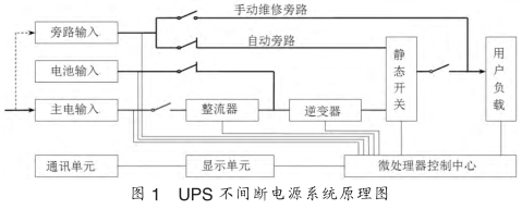 UPS是一個多重保護的交流供電設備。當主電正常時,主電輸入經整流開關控制,首先經諧波濾波器,再經主電整流變換成純凈的直流電,濾除主電中的干擾,然后通過逆變器將直流電變換成純凈的正弦交流電輸出,同時給蓄電池充電;當UPS連接上電池組時對電池組的電壓和電池進行測量,整流器進入電流和電壓雙環控制,當電池電壓低時為恒流模式充電,當電池電壓達到浮充電電壓時,自動轉為恒壓充電模式。當主電異常時,則將蓄電池儲存的直流電逆變成交流輸出,保證用戶負載長期處于不斷電高質量電源下可靠運行;當逆變器關閉或故障時則自動轉為旁路供電。手動維修旁路保證在不斷電的情況下對UPS進行維護或檢修。